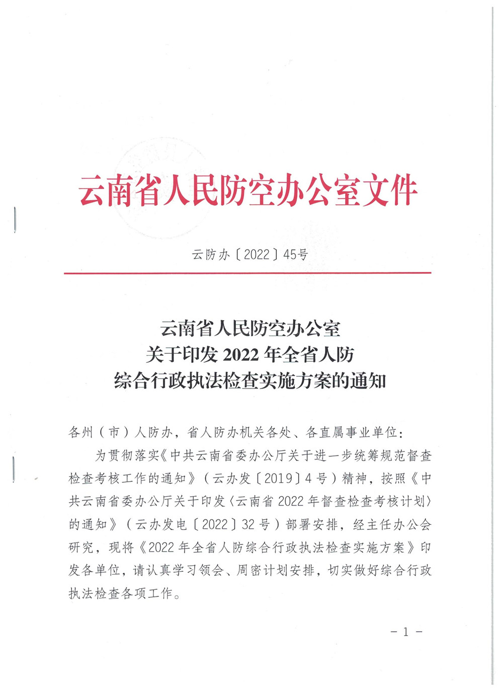 云南省人民防空办公室关于印发2022年全省bet3365vip_beat365唯一网址_365速发app下载平台注册综合行政执法检查实施方案的通知