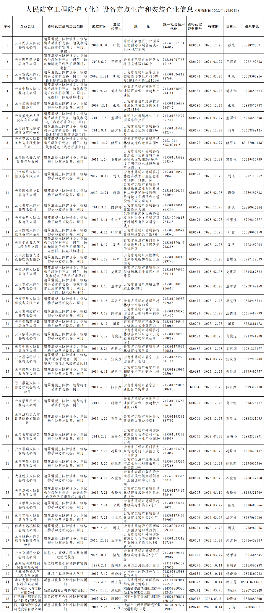 人民防空工程防护(化)设备定点生产和安装企业信息
