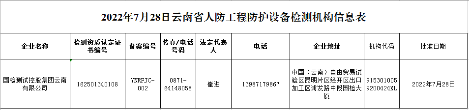 2022年7月28日云南省bet3365vip_beat365唯一网址_365速发app下载平台注册工程防护设备检测机构信息表