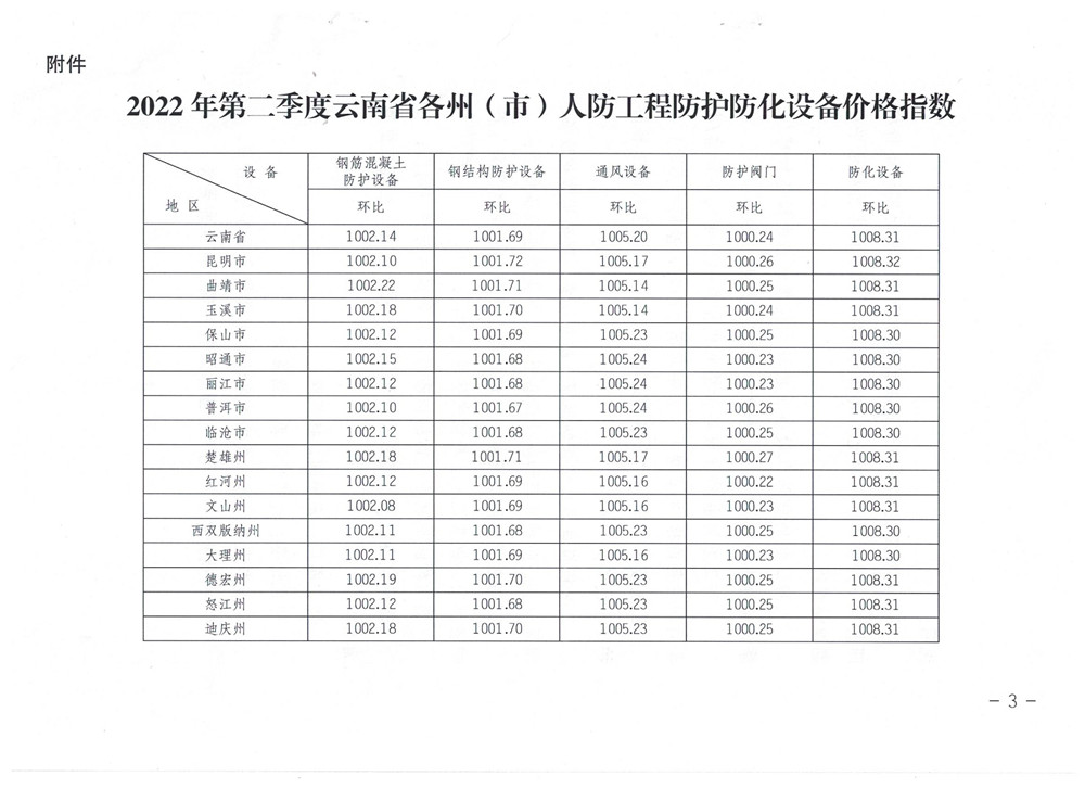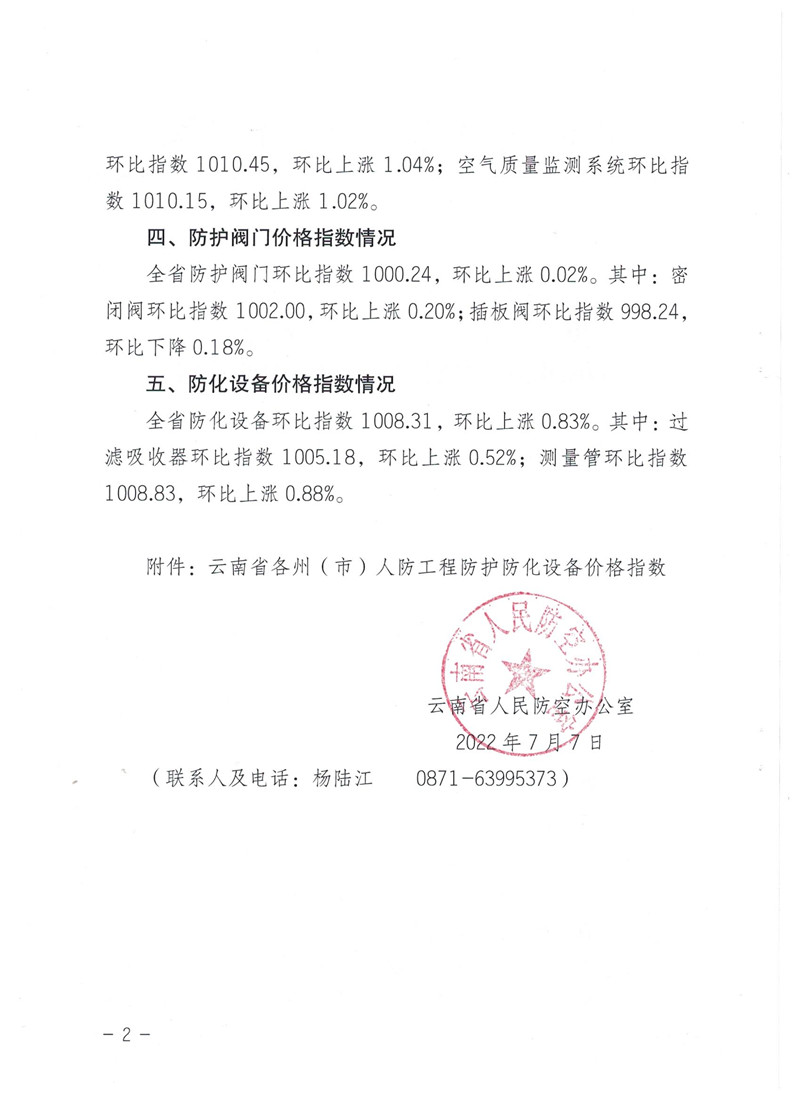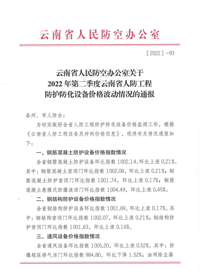 云南省人民防空办公室关于2022年第二季度云南省bet3365vip_beat365唯一网址_365速发app下载平台注册工程防护防化设备价格波动情况的通报