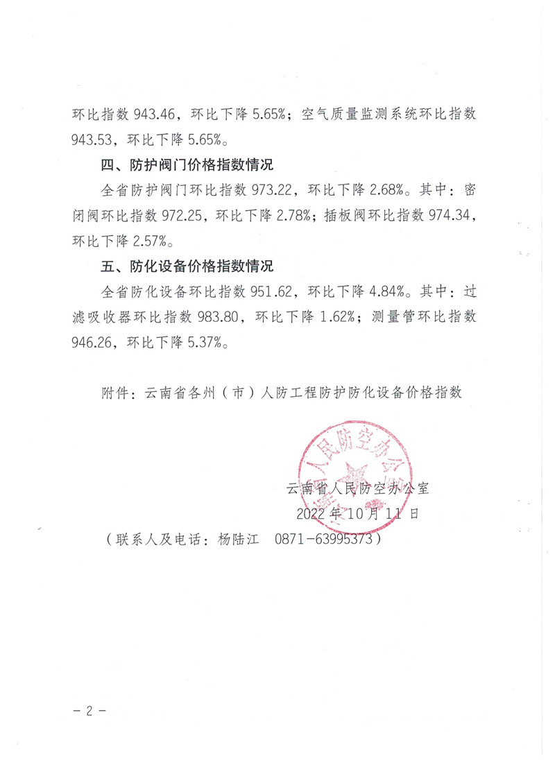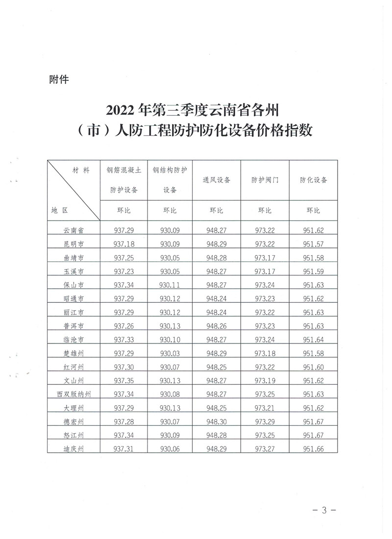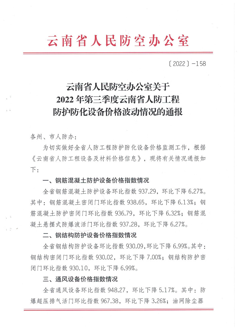 云南省人民防空办公室关于2022年第三季度云南省bet3365vip_beat365唯一网址_365速发app下载平台注册工程防护防化设备价格波动情况的通报